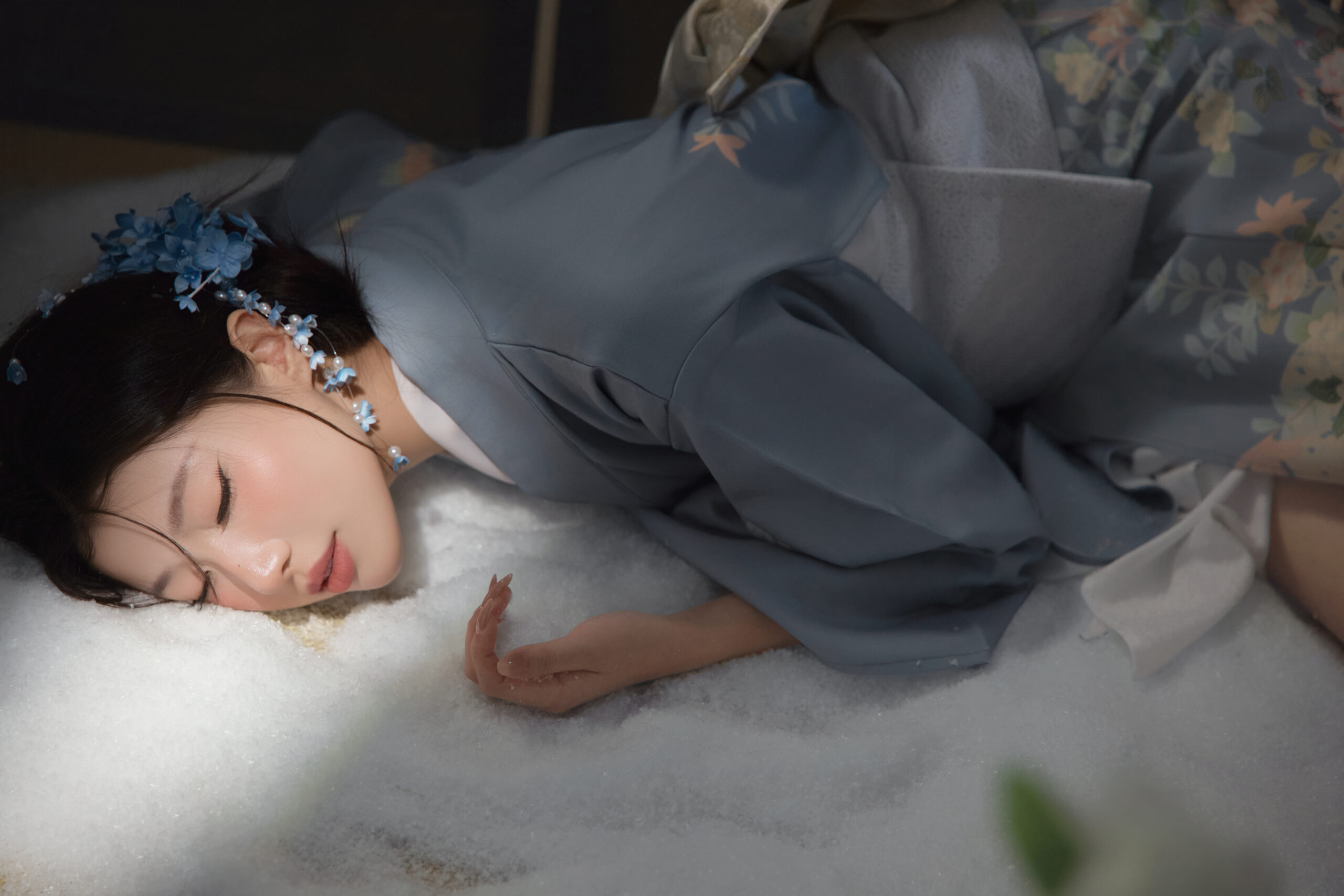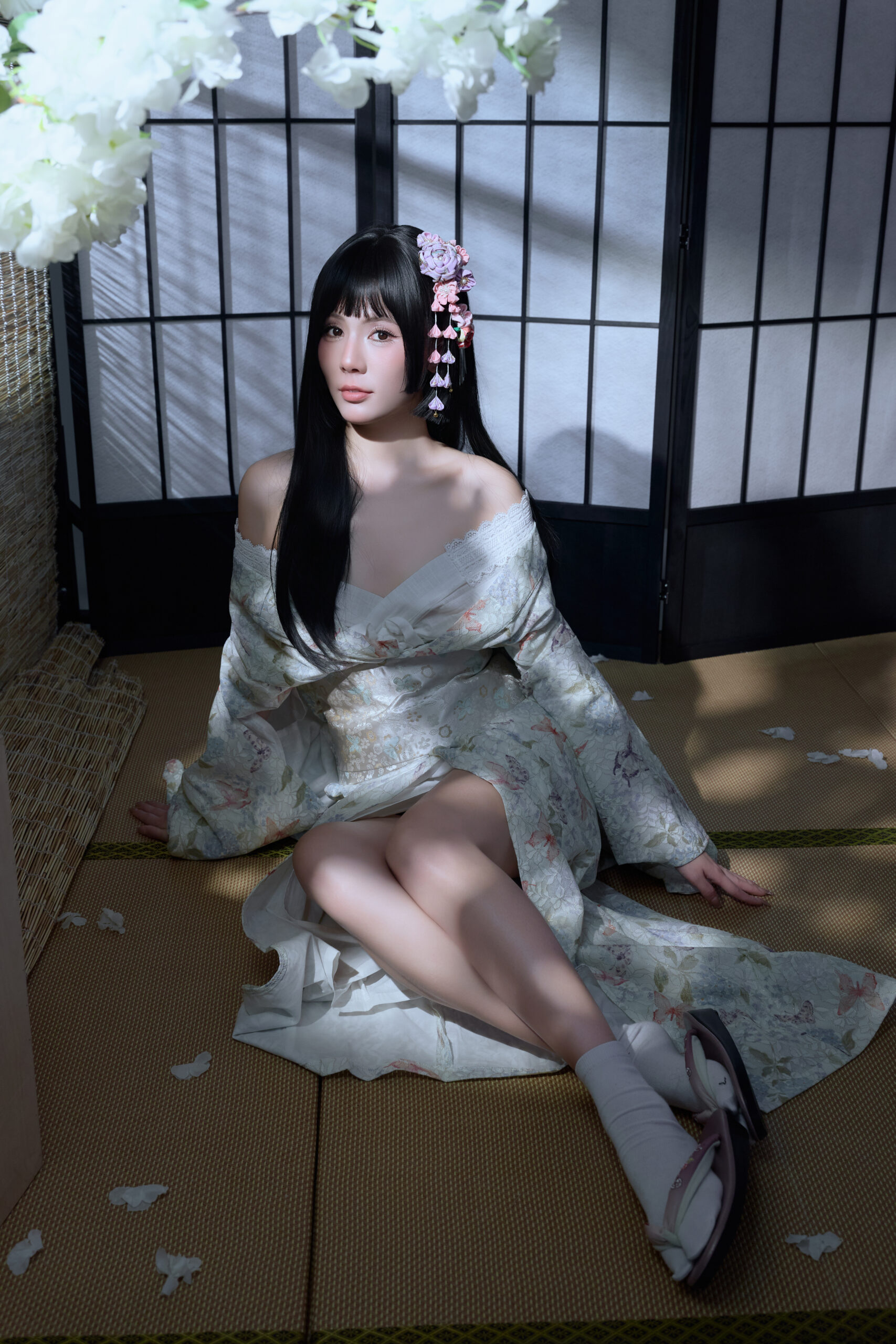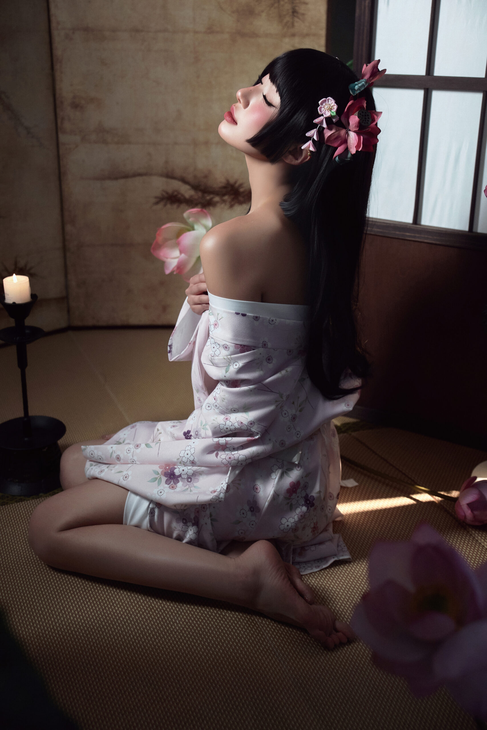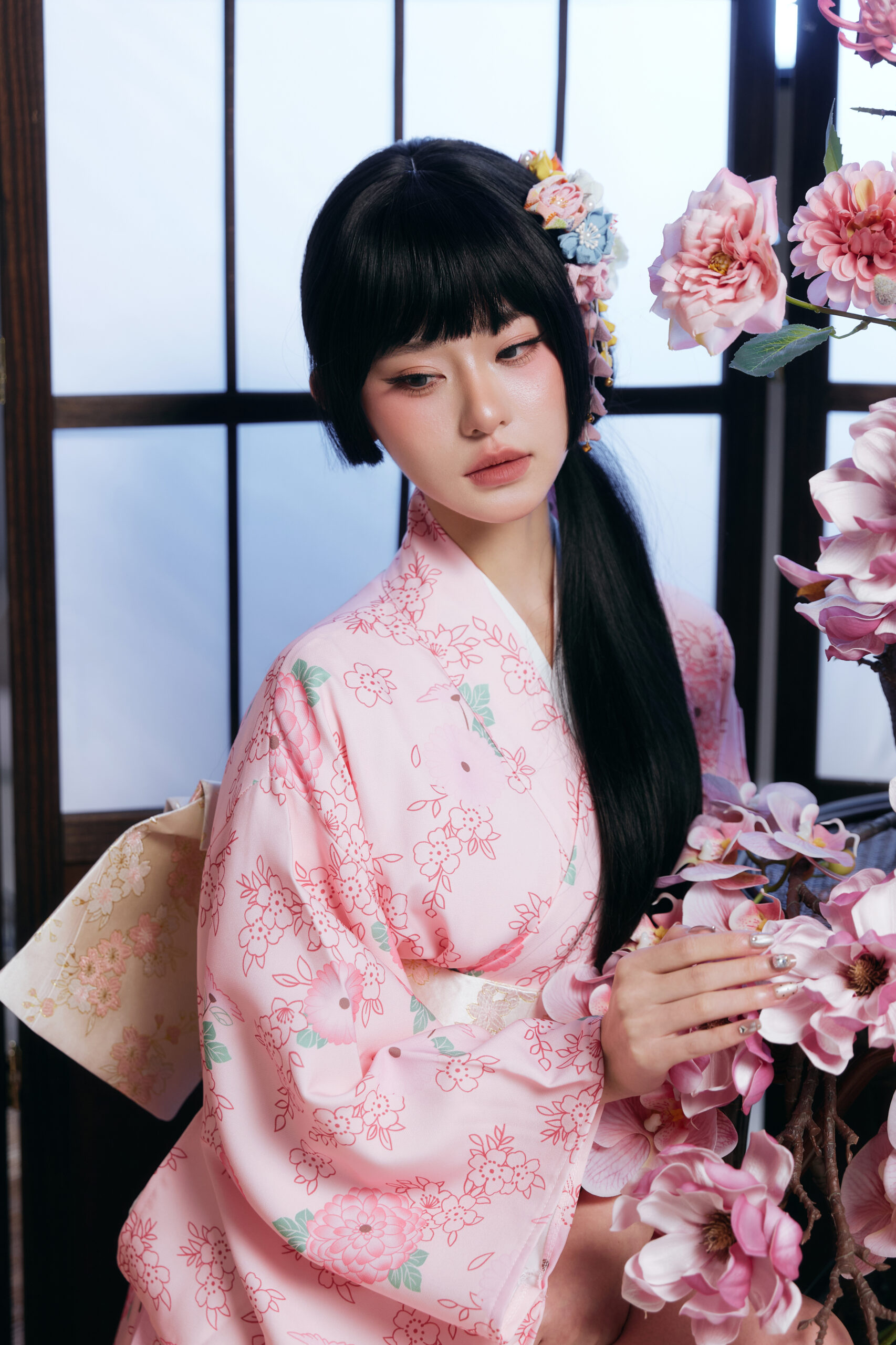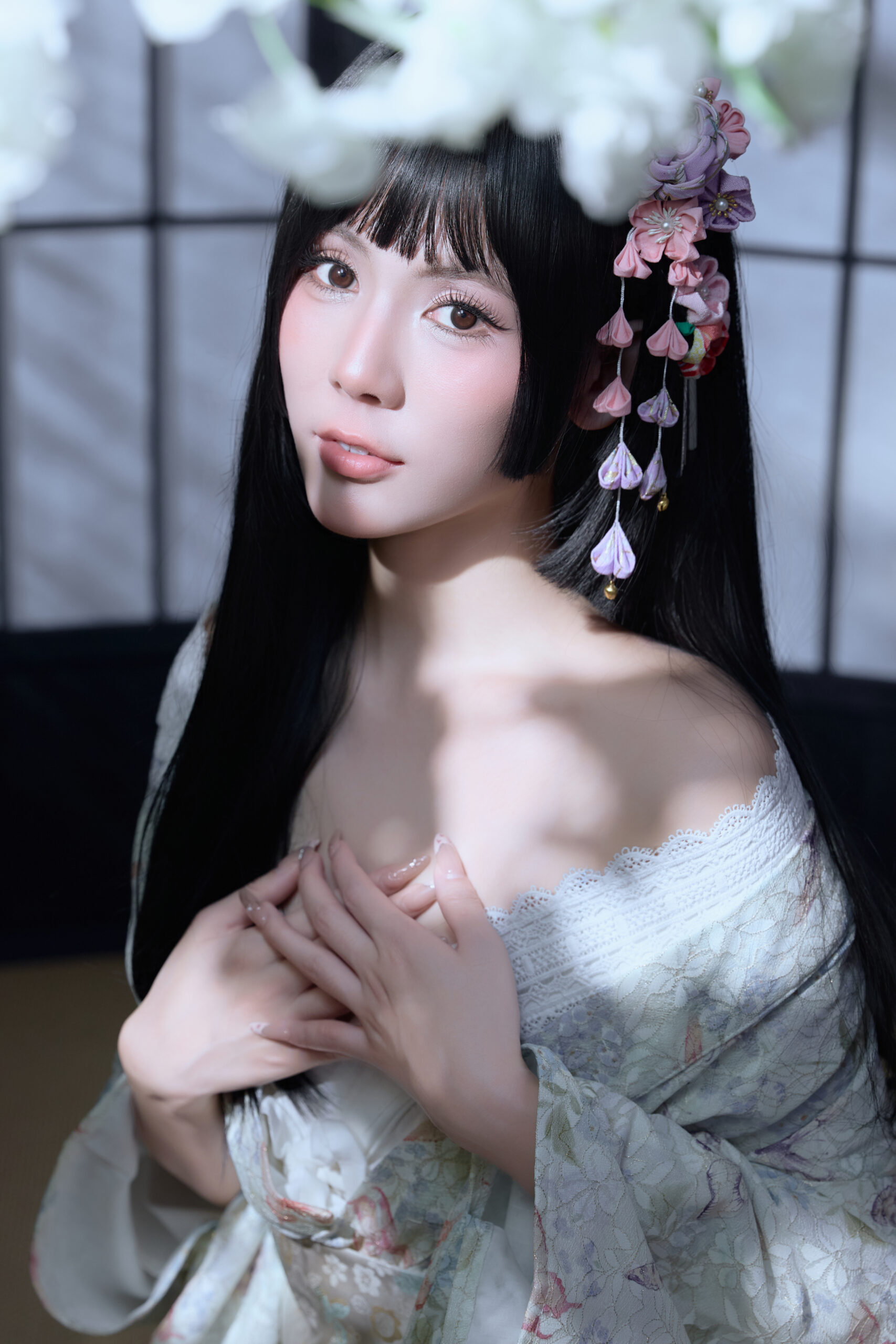 造型师给我做的发型太美了!很多真花作为头饰,搭配流苏步摇,走起路来摇曳生姿。而且为了配合和服的厚重感,妆容画得很清淡但有神,重点突出了腮红,那种“宿醉妆”的感觉特别可爱。